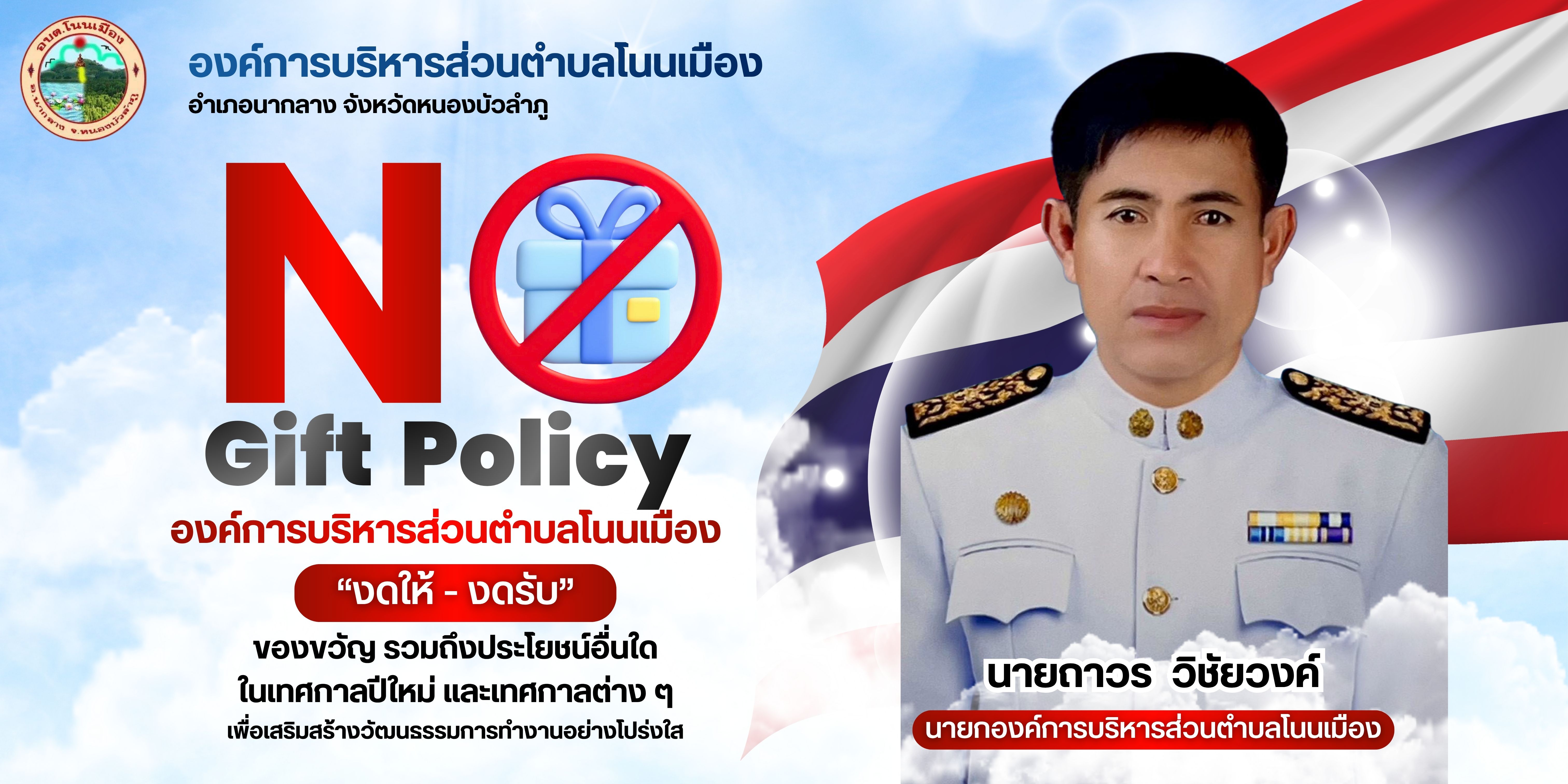 องค์การบริหารส่วนตำบลโนนเมือง มุ่งเน้นการบริหารงานอย่างโปร่งใสตามหลักธรรมาภิบาล นำโดย นายถาวร วิชัยวงศ์ นายกองค์การบริหารส่วนตำบลโนนเมือง ขอประกาศนโยบาย "งดรับ - งดให้" ของขวัญและของกำนัลทุกชนิดจากการปฏิบัติหน้าที่ เพื่อเสริมสร้างวัฒนธรรมองค์กรที่ซื่อสัตย์สุจริต และป้องกันการทุจริตคอร์รัปชันในทุกรูปแบบ